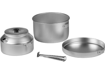 Ein einfaches Set, das für alle Wärmequellen geeignet ist. abnehmbarer Griff Technische Daten: Material: Aluminium Gewicht: 510 g Abmessungen: Ø185 x 100 mm Lieferumfang: 1 Kochtopf 2 Liter 1 Bratpfanne Ø 180 mm 1 Kessel 0,9 L 1 Griff
