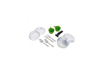Leichtes Kochgeschirrset aus Aluminium für 1 Person. Platzsparend, ideal zum Mitnehmen zum Beispiel in den Wanderurlaub oder auf Erkundungstouren. Technische Daten: Gewicht: 478 g Material: Aluminium Maße: Bratpfanne ø16,5 cm – Höhe 5,5 cm Bratpfanne ø17 cm – Höhe 2,5 cm Teller ø15,7 cm Lieferumfang: 2 Bratpfannen 2 Teller 2 Trinkbecher 2 Löffel 2 Gabeln 1 ABS-Pfannengriff 1 Gurtband