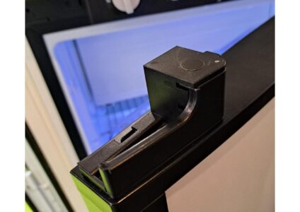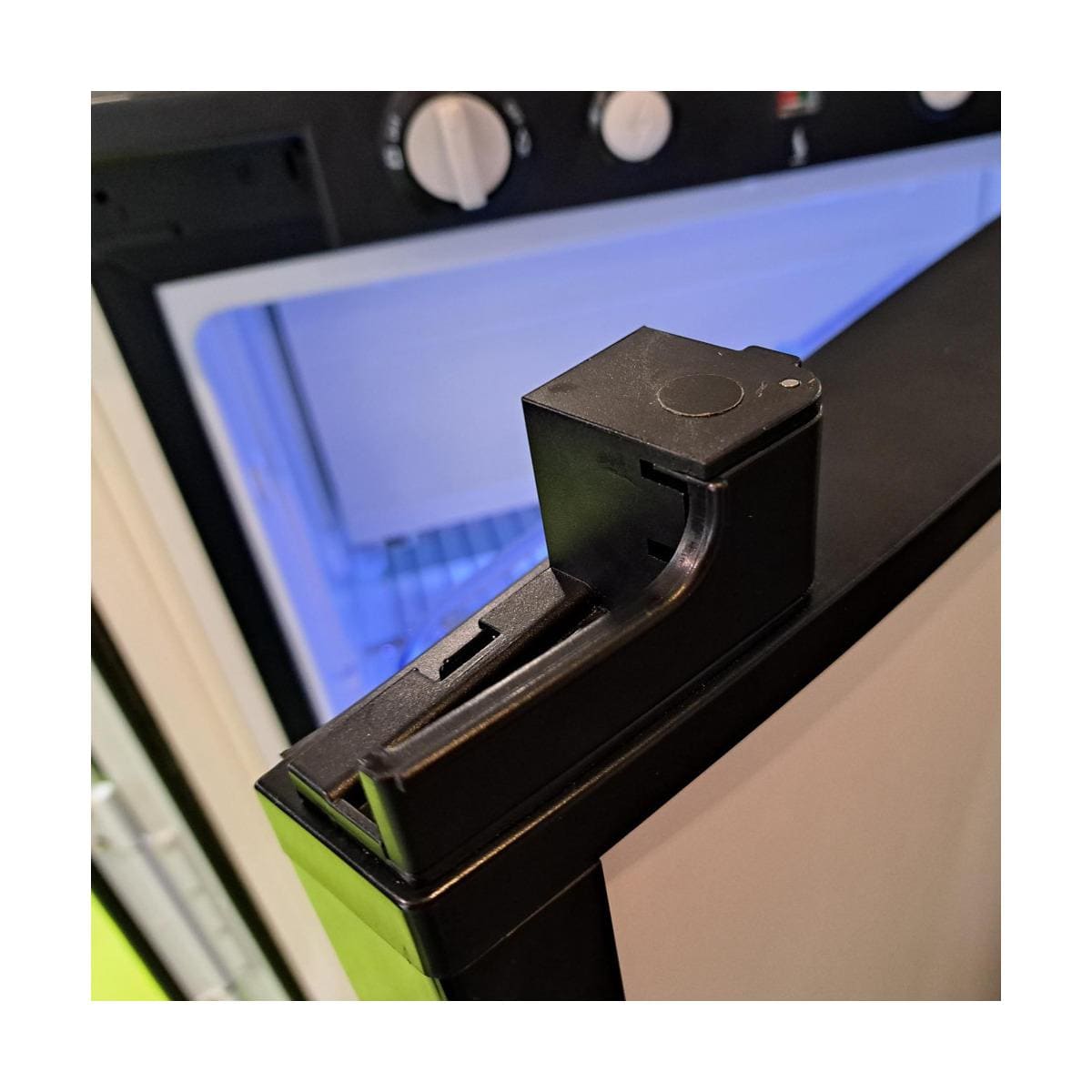 Kühlschrankschloss für links oben an der Kühlschranktür. Die Kühlschranktür ist dann nach rechts aufgeschlagen.