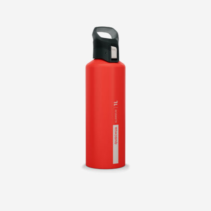 Für bequemes Trinken auf Wanderungen: Mittelgroße Aluminium-Trinkflasche mit Schnellverschluss, lässt sich mit einer Hand öffnen.
