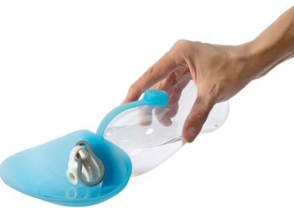 Trinkflasche für Unterwegs. Das Silikonblatt lässt sich als Ausgabe des Wassers verwenden. Die Flasche passt perfekt in Ihre Tasche oder Ihren Becherhalter im Auto. Technische Daten: Material: PET Polyethylenterephthalat, Silikon Farbe: hellblau Inhalt: 0,6 l Maße (⌀ x H): 6,5 × 21 cm Gewicht: 150 g