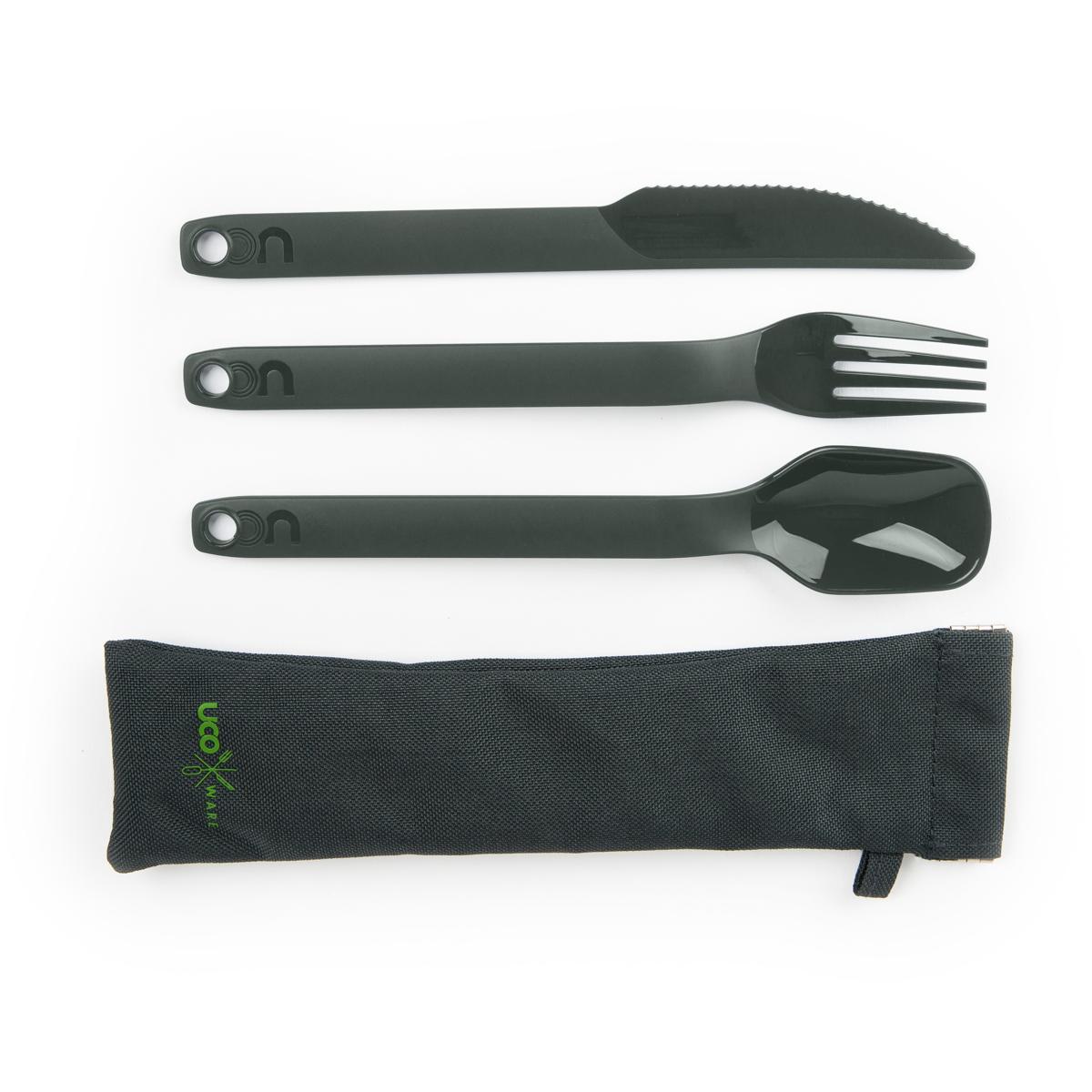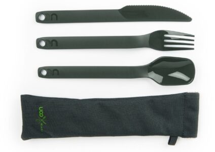 Ein praktisches Besteckset (Messer, Gabel, Löffel) im schönen Polyester Etui. Ein Loch dient zur Befestigung des Besteckset am Rucksack oder an der Tasche. Das Set ist spülmaschinefest und aus 100 % recyceltem Kunststoff hergestellt. spülmaschinefest aus 100 % recyceltem Kunststoff Technische Daten: Material: Polypropylen Gewicht: 52 g Packmaß: 22 x 5 x 2 cm Farbe: grau Lieferumfang: 1 Messer 1 Gabel 1 Löffel 1 Etui