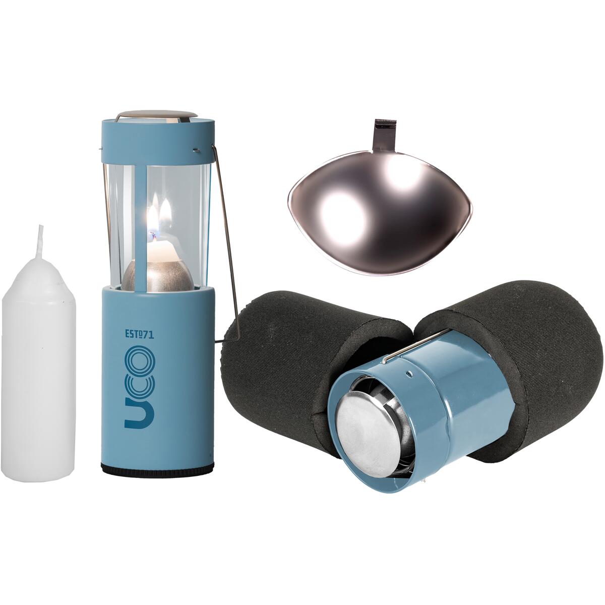 Komplettset mit der schönen, anodisierten UCO Kerzenlaterne, einem einsetzbaren Seitenreflektor und der praktischen Neoprenhülle für sicheren Transport der Laterne. Die Kerze der Laterne wird durch eine Feder von unten nach oben stets in die ideale Leuchthöhe gedrückt. Ideal für unterwegs und ein schönes Geschenk für alle Liebhaber stilvoller und schöner Beleuchtung. Laterne mit farblich anodisiertem Gehäuse Technische Daten: Maße: 12,5 cm Durchmesser: Ø 5,5 cm Gewicht: 180 g Farbe: hellblau
