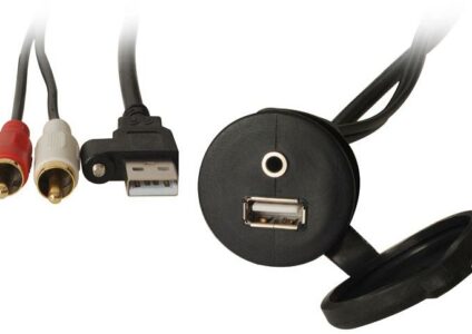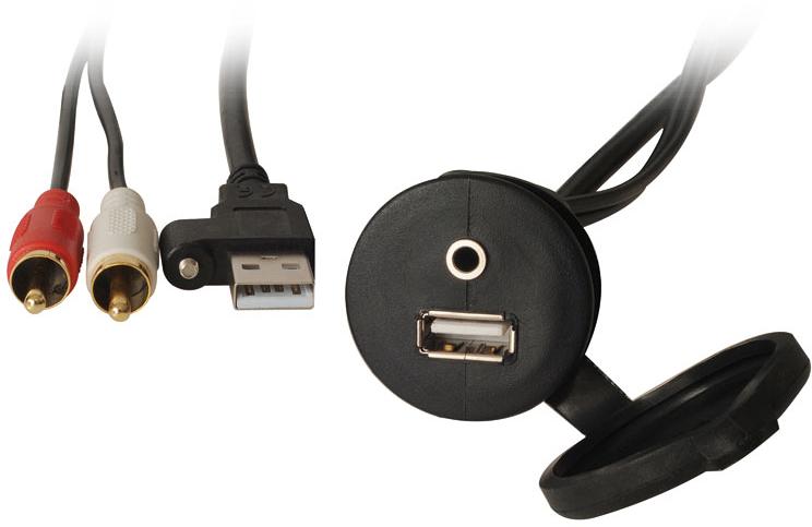 Erleichtert durch optimale Platzierung der Buchse (USB 2.0) den Anschluss von z. B. Smartphones an Geräte mit rückseitigen USB- und AUX-Anschlüssen. Die Buchse wird einfach in einer 25 mm Bohrung (USB/AUX) montiert. Länge 2m.