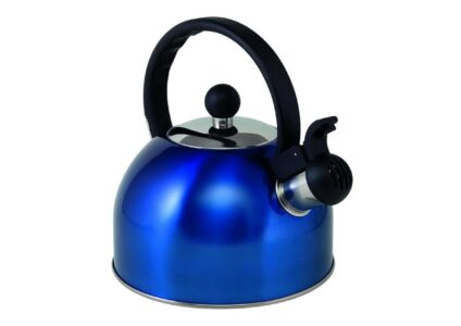 Flötenkessel speziell für Gaskochfelder hergestellt. Kessel und Deckel aus Edelstahl mit hitzebeständigem Griff. Technische Daten: Volumen: 1,5 Liter Material: Edelstahl Farbe: blau
