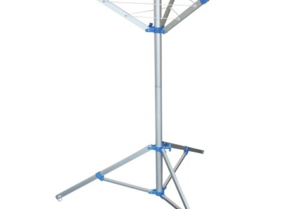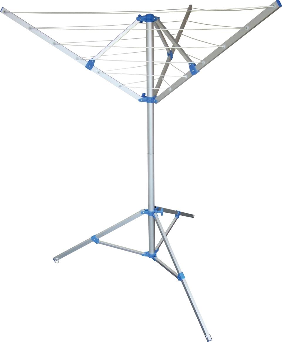 Wäschespinne 3-Arm Gestell aus Aluminium – leicht und stabil. Standfest auf jedem Untergrund dank stabilem 3-Bein-Stativ. Inklusive praktischer Tragetasche (100 % Polyester) und Heringen zur standsicheren Verankerung. Technische Daten: Max. Tragkraft 22 kg. Maße: (HxBxT) 145 x 120 x 120 cm. Gewicht: ca. 1,85 kg