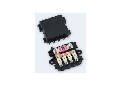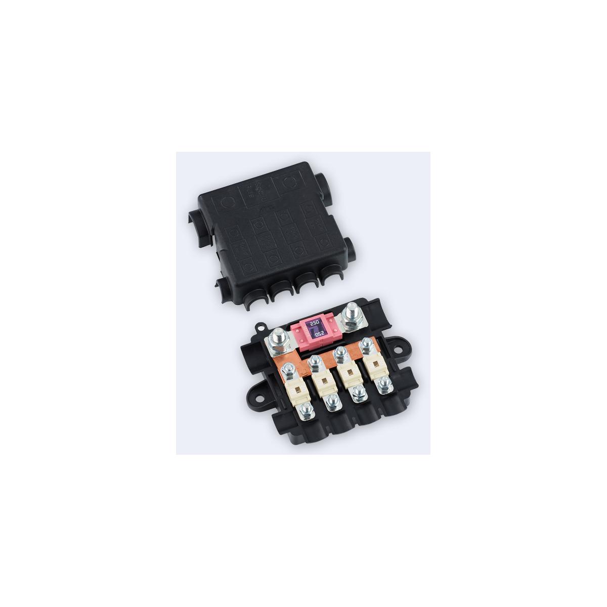 Hochlast-Sicherungshalter 5-fach mit Deckel für Hochlast-Sicherungen und Kfz-Schraubsicherungen Voll isolierter Sicherungshalter mit einer Hauptsicherung (Hochlast-Sicherung) über Gewindebolzen M8 und 4 Stromkreis-Sicherungen über Gewindebolzen M5 zur Absicherung großer Verbraucher bzw. Hochlast-Stromkreise. Technische Daten: Maße: 116 x 95 x 40 mm Hauptsicherung: M8 Kfz-Schraubsicherungen: M5 Hinweis: Lieferung ohne Sicherungen