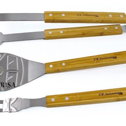 Ausgefallenes 3-teiliges Grillbesteck Set aus der VW Collection im kultigen T1 Bulli Design. Das hochwertige Set umfasst eine Grillgabel, einen Fleischwender und eine Grillzange aus Edelstahl. Alle drei Teile sind mit edlen Bambusgriffen ausgestattet. Mit dem handlichen Etui mit Tragegriff ist es perfekt für Campingfreaks und echte Grillmeister. Besonders tolles Extra: Alle Werkzeuge mit eingestanzter VW Bulli Front! im edlen Design des VW T1 mit eingestanzter Bulli Front aus 100% Edelstahl mit…