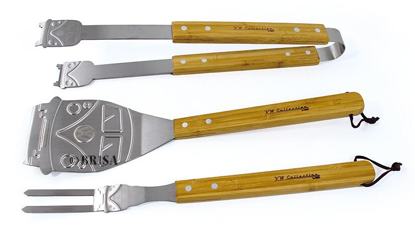 Ausgefallenes 3-teiliges Grillbesteck Set aus der VW Collection im kultigen T1 Bulli Design. Das hochwertige Set umfasst eine Grillgabel, einen Fleischwender und eine Grillzange aus Edelstahl. Alle drei Teile sind mit edlen Bambusgriffen ausgestattet. Mit dem handlichen Etui mit Tragegriff ist es perfekt für Campingfreaks und echte Grillmeister. Besonders tolles Extra: Alle Werkzeuge mit eingestanzter VW Bulli Front! im edlen Design des VW T1 mit eingestanzter Bulli Front aus 100% Edelstahl mit…