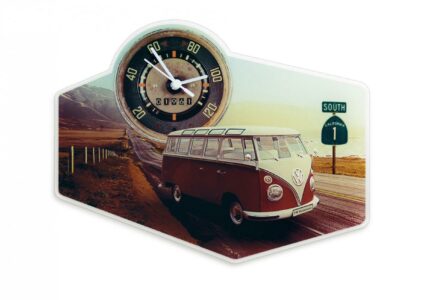 Elegante Wanduhr im farbenfrohen VW T1 Highway Style von der VW Collection by Brisa. Die Acrylglasplatte zeigt einen VW „Bulli“ Bus/Campervan in klassischem Frontmotiv an einem Strand oder auf dem Highway. Durch die hochwertig eingesetzten Materialien vereint unsere VW-T1 Wanduhr, Design und Qualität. Da die besondere Betonung auf das ansprechende Motiv zur Geltung gebracht wird, wurde auf einen Rahmen verzichtet. Verschönern Sie Ihre Wohnräume, das Büro, die Werkstatt oder den Hobbykeller – die…