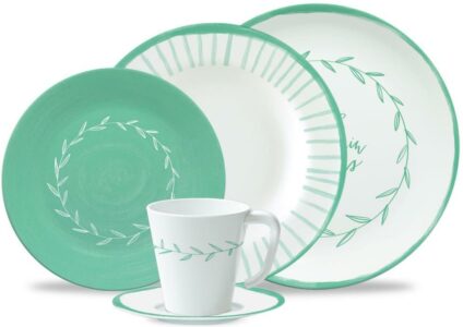 Das trendige Geschirrset für vier Personen besteht aus Melamin und ist daher besonders langlebig und oberflächenhart. Das frühlingshafte Design Spring in Progress Green macht sich gut auf jedem Esstisch. Das Geschirr ist spülmaschinenfest, kann platzsparend gestapelt werden und wirkt optisch fast so wie Porzellan. Technische Daten: Material: Melamin Packmaß: 37,5 × 25 × 12 cm Gewicht: 2,7 kg Lieferumfang: 4 Henkelbecher 4 flache Teller 4 Suppenteller 4 Dessertteller