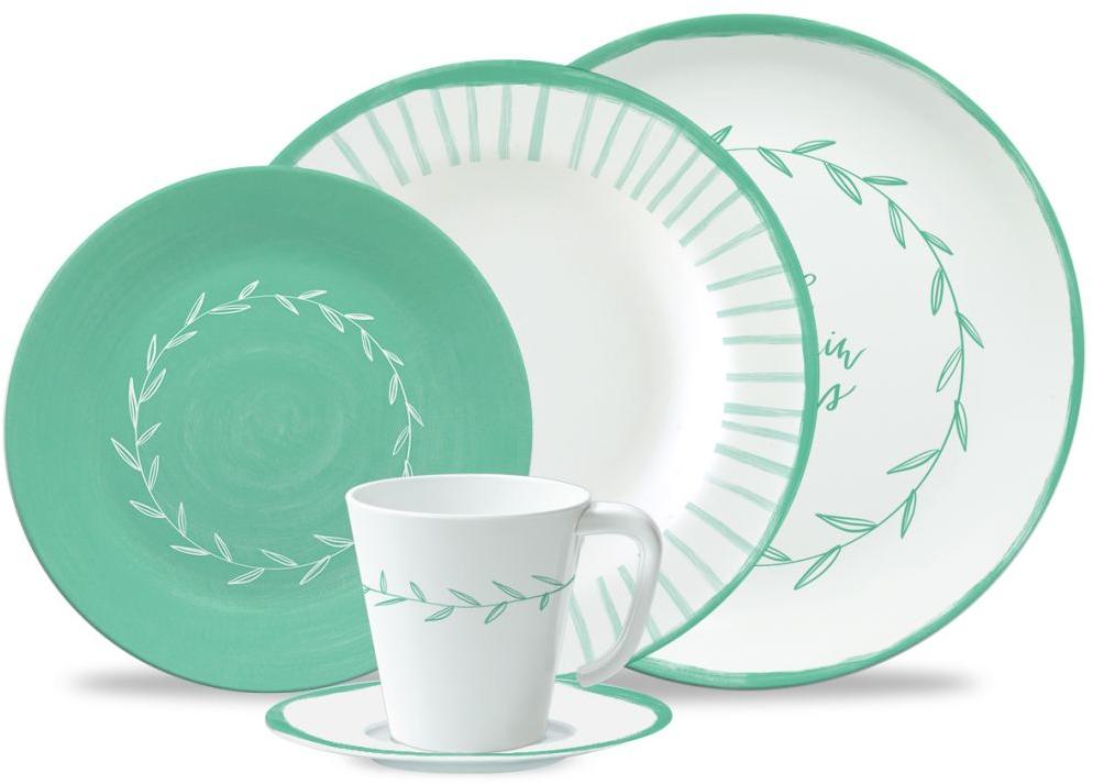 Das trendige Geschirrset für vier Personen besteht aus Melamin und ist daher besonders langlebig und oberflächenhart. Das frühlingshafte Design Spring in Progress Green macht sich gut auf jedem Esstisch. Das Geschirr ist spülmaschinenfest, kann platzsparend gestapelt werden und wirkt optisch fast so wie Porzellan. Technische Daten: Material: Melamin Packmaß: 37,5 × 25 × 12 cm Gewicht: 2,7 kg Lieferumfang: 4 Henkelbecher 4 flache Teller 4 Suppenteller 4 Dessertteller