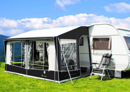 Das Maxi 380 ist ein stabiles Teilvorzelt. Die Gestängekonstruktion mit ‘Knick’ sorgt für Stabilität. Die beiden mitgelieferten, gebogenen Stützstangen drücken die festgenähten Schaumstoffkissen an den Wohnwagen und sorgen so für einen perfekten Anschluss. Wände: Ten Cate außenseitig beschichtet, abwaschbar Dach: Ten Cate außenseitig beschichtet, abwaschbar Entlüftung: verschließbare Entlüftung in beiden Seitenwänden Technische Daten: Breite: 385 cm Tiefe: 235 cm Montagehöhe: 235 – 255 cm Gestänge:…