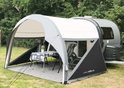 Walker Sunflexx ist ein aufblasbares Sonnendach, mit dem Sie einfach und schnell reisen können. Beide Seiten haben ein großes Panoramafenster, das hochgeklappt werden kann. Die frischen Anthrazitfarben und das frische Design machen Sunflexx attraktiv zu sehen. Technische Daten: geeignet für T@B 320 Material: Ten Cate Design Gewebe 240 gr/m2 Wassersäule: 3000 mm Tiefe: 240 cm Farbe: anthrazit Gewicht: 7,5 kg Gestänge: Airtube Lieferumfang: Sonnendach Sunflexx 320 doppelte Luftpumpe Hinweis: Das…
