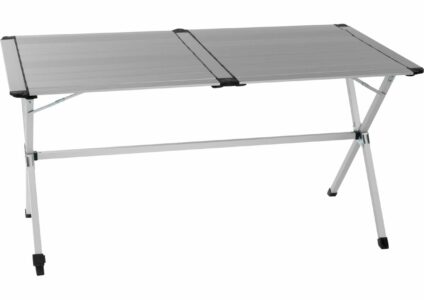 Leichtgewicht Alu Camping-Tisch mit rollbarer Tischplatte aus Alu Paneelen und höhenverstellbaren Tischbeinen. leichte Montage und kleines Packmaß mit verstellbarem Bein durchgehender Tischplatte Technische Daten: Material: Aluminium Maße: 110x70cm Gewicht: 5 kg Maximale Belastung: 30 kg Höhe: 70 cm Lieferumfang: 1 Rolltisch inkl. Aufbewahrungstasche