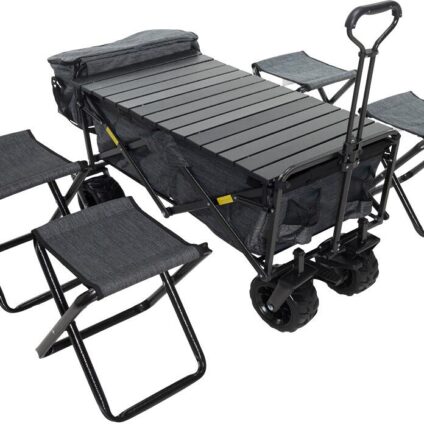 Wecamp Bollerwagen mit Zubehör. kraftvolle Räder mit Bremse Technische Daten Farbe: grau Maße (LxBxH): 90 x 48 x 56/73 cm Maße zusammengeklappt: 76 x 63 x 26 cm Tischplatte: 84 x 50 cm Gewicht Trolley: 10,5 kg Gesamtgewicht: 20 kg Hockerhöhe: 39 cm Hockergewicht: 1,7 kg Material: Stahl Lieferumfang: 4 Hocker, Tischplatte und Kühltasche