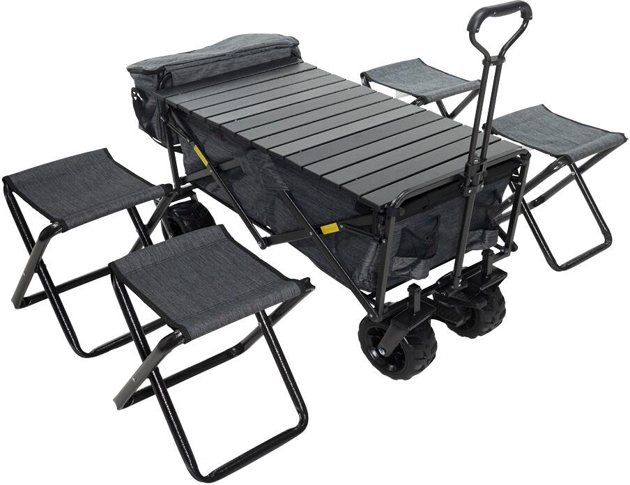 Wecamp Bollerwagen mit Zubehör. kraftvolle Räder mit Bremse Technische Daten Farbe: grau Maße (LxBxH): 90 x 48 x 56/73 cm Maße zusammengeklappt: 76 x 63 x 26 cm Tischplatte: 84 x 50 cm Gewicht Trolley: 10,5 kg Gesamtgewicht: 20 kg Hockerhöhe: 39 cm Hockergewicht: 1,7 kg Material: Stahl Lieferumfang: 4 Hocker, Tischplatte und Kühltasche