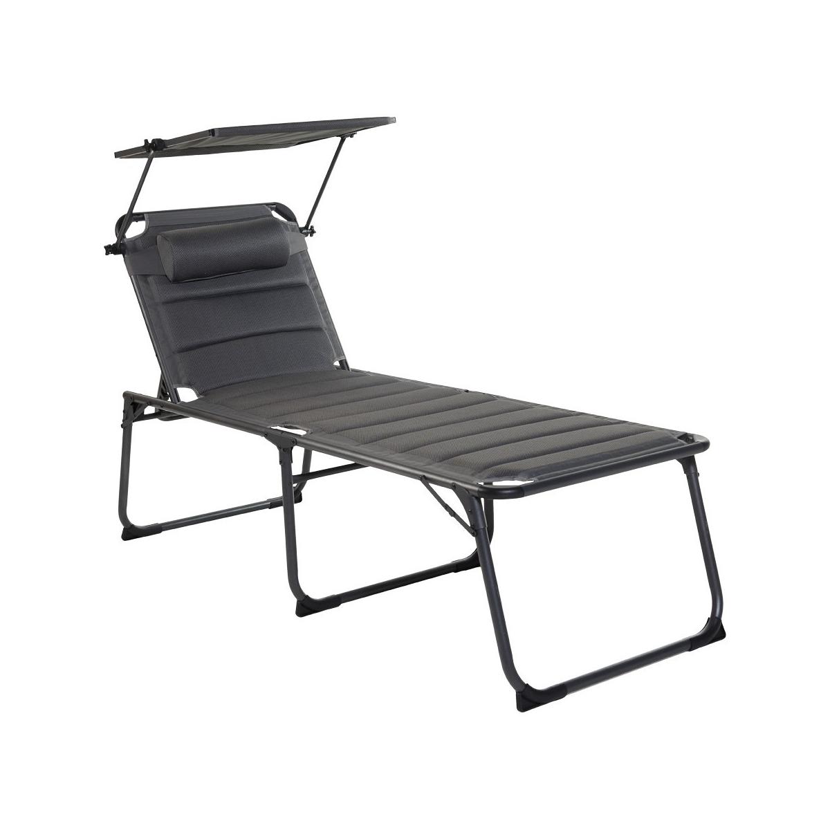 Graues Duramesh mit grauem Aluminiumrahmen mit Sonnenschutzdach Technische Daten Farbe: grau Maße (LxBxH): 198 x 69 x 48 cm Maße gefaltet (LxBxH): 89 x 69 x 26 cm Material: Aluminiumrahmen Gewicht: 7,0 kg Lieferumfang: 1 Sonnenliege