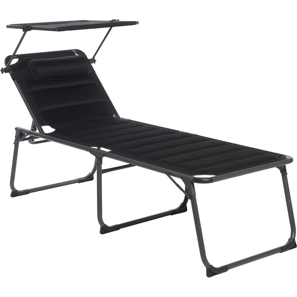 Graues Duramesh mit grauem Aluminiumrahmen mit Sonnenschutzdach Technische Daten Farbe: schwarz Maße (LxBxH): 198 x 69 x 48 cm Maße gefaltet (LxBxH): 89 x 69 x 26 cm Material: Aluminiumrahmen Gewicht: 7,0 kg Lieferumfang: 1 Sonnenliege