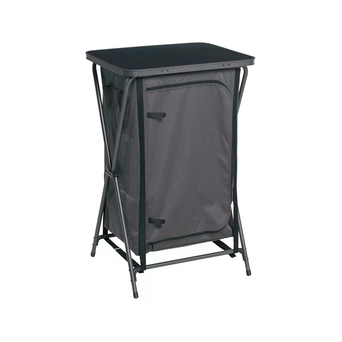 Dank seines einzigartigen Klappsystems lässt sich dieser Schrank schnell und einfach öffnen und zusammenfalten. Die drei Regale bieten viel Stauraum und können im Handumdrehen entfern werden. Somit ist er der ideale Begleiter für deinen Camping-Ausflug. mit drei Regalen feste Deckplatte schnelle und einfache Handhabung Technische Daten: Abmessungen (HxBxT): 97 x 60 x 52 cm Belastung: 30 kg Gewicht: 5,8 kg Farbe: grau Lieferumfang: Campingschrank