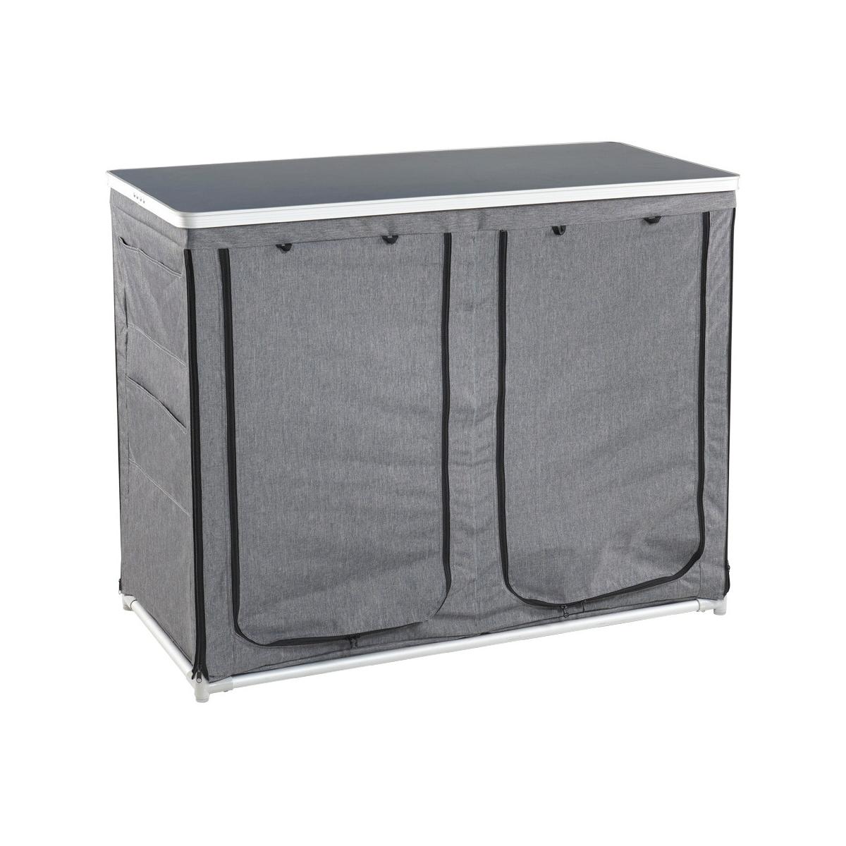 Modus Campingschrank Einlegeböden und feste MDF-Abdeckplatte Technische Daten Abmessungen (HxBxT): 89 x 110 x 53 cm Maße zusammengeklappt: 110 x 53 x 20 cm Einlegeböden: 6 Tragfähigkeit: 30 kg Gewicht: 10 kg Farbe: grau Lieferumfang: Campingschrank