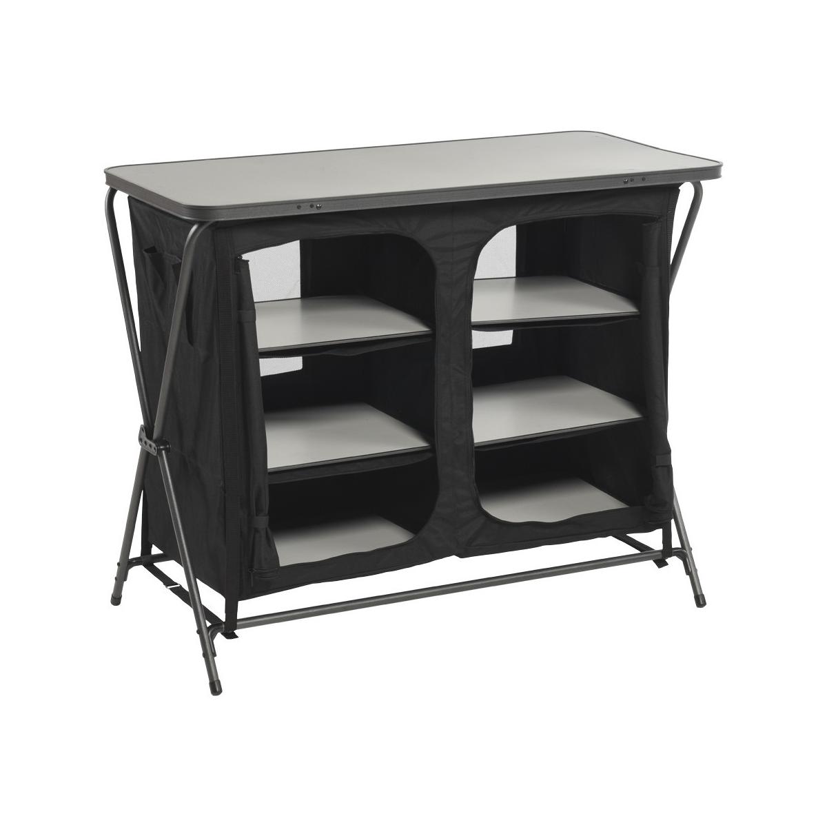 Campingschrank mit 4 Einlegeböden und Deckplatte. Schnelles Öffnen und Schließen durch einzigartiges Klappsystem. Die Einlegeböden werden herausgenommen, wenn der Schrank zusammengeklappt werden soll. einzigartiges Klappsystem herausnehmbare Einlegeböden Technische Daten Farbe: schwarz Belastbarkeit: 30 kg Maße (H x B x T): 88 x 110 x 53 cm. Gewicht: 9,8 kg Lieferumfang: Campingschrank