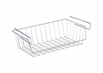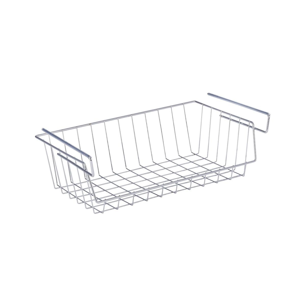 Dieser praktische Regaleinhängekorb aus Chrom wird einfach an einen Regal- oder Schrankboden eingehängt. So schafft der Ablagekorb zusätzlichen Stauraum in Küche, Schlafzimmer und im gesamten Haushalt. Ablagekorb einfach an einem Regalfach einzuhängen Zusätzlicher Stauraum für Servietten, Küchentücher Auch im Kleiderschrank für die Aufbewahrung von Kleinteilen oder Socken einsetzbar Aus Chrom mit Anti-Rutsch-Gummierung Technische Daten: Material: verchromtes Metall Farbe: silber glänzend Höhe: 27 cm…