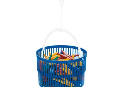 Der blaue Wäscheklammer-Korb ist aus stabilem Kunststoff gefertigt. Er bietet Platz für viele Klammern und kann ganz einfach mit dem Aufhänger an die Wäscheleine gehängt werden. So sind alle Klammern schnell griffbereit und dekorativ verstaut. Gleich mitgeliefert werden 30 farbenfrohe Wäscheklammern aus Kunststoff. Technische Daten: Material: Kunststoff Breite: 19 cm Tiefe: 19 cm Höhe: 6,5 cm Farbe: blau Wäscheklammern: bunt Lieferumfang: 1x Korb mit 30 Wäscheklammern