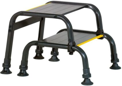Doppeltrittstufe mit sehr guter Stabilität. Das Führungssystem bietet ein kompaktes Packmaß während des Transports oder der Lagerung. Mit sechs verstellbaren Beinen ist sie auf jeden Untergrund leicht anzupassen. Die extra großen Bodenplatten sorgen für eine gute Druckverteilung. Technische Daten: belastbar bis: 200 kg Farbe: schwarz Maße (B x T x H): 47 × 80 × 39 cm Gewicht: 5,6 kg