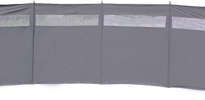 Schnell aufzubauender und stabiler Windschutz. Material: Baumwollmischgewebe (65 % Polyester, 35 % Baumwolle). Im Lieferumfang sind Stahl-Aufstellstangen, Abspannleinen und Nägel enthalten. Größe 500 x 150 cm, Gewicht 4,5 kg. Variante mit 4 Fenstern