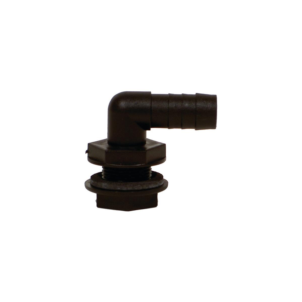 Winkel -Tülle für Tankanschluss mit Kontermutter und Dichtung. Technische Daten: Gewinde: 1¼ Gewinde Länge: 39 mm Tülle: 40 mm Winkel: 90º Farbe: schwarz Lieferumfang: 1x Tülle