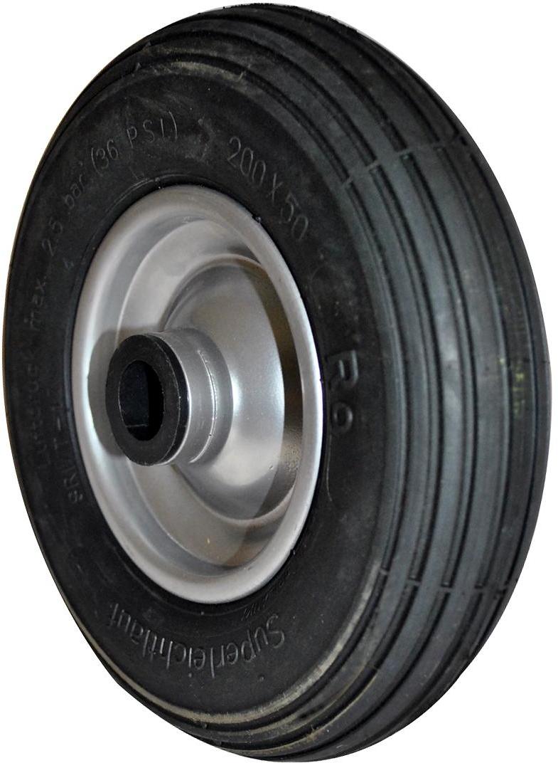 Ersatzrad Luftreifen mit Stahlfelge. Ideal für raue und feuchte Umgebung. Technische Daten: Bezeichnung: Luftreifen gelagert Felge: Stahl Nabe: ø 20 x 60 mm Belastbar bis: 75 kg Größe: 200 x 50 mm Bereifung: Luft Packmaß: 200 × 200 × 60 mm Gewicht: 0,7 kg