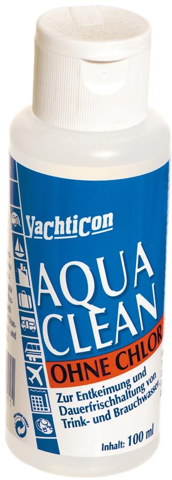 Yachticon Aqua Clean AC 1000 – Inhalt 100 ml Flüssigkeit. Packung reicht für 1000 l. Aqua Clean – ohne Chlor, zur Entkeimung und Dauerfrischhaltung Ihres Trinkwassers. Dieses Produkt auf Silberbasis hält Ihr Trinkwasser bis 6 Monate keimfrei. Aqua Clean Quick auf Silberbasis mit Chlorzusatz zur Schnellentkeimung.