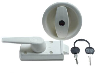 Komplette Türschlosseinheit für den Wohnwagen inklusive Schrauben und Schlüsseln. Technische Daten: System STS & ZADI Wandstärke: 28 mm – 36 mm Farbe: weiß Maße: Außen: Ø 110mm Innen: 120 x 56 mm Lieferumfang: Außen- & Innenteil ZADI Zylinder & 2 Schlüssel