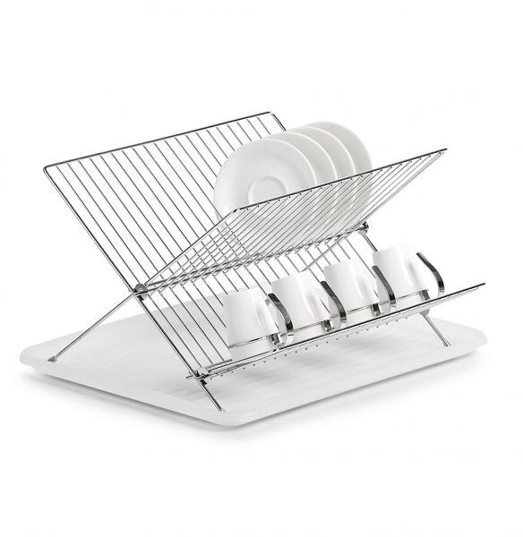 Dieser praktische Geschirr-Abtropfständer aus hochwertigem Metall und robustem Kunststoff schafft zusätzliche Abtropffläche in Ihrer Küche. Damit sich kein Wasser staut, ist der Abtropfständer mit mehreren Rillen versehen. Technische Daten: Gewicht: 980 g Maße: 32 x 43 x 24 cm Packmaße: 44 x 37,5 x 3 cm Material: Metall / Kunststoff Farbe: silber, weiß Lieferumfang: 1 Abtropfständer 1 Auffangschale
