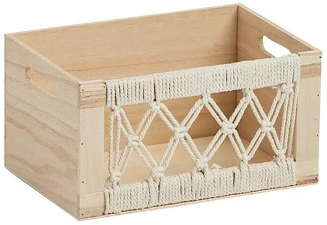 Die Aufbewahrungskiste Boho überzeugt mit stylischen Flechtdetails an der Vorderseite und ist ein absolutes Highlight in jedem Raum. Passend zu jeder Einrichtung bietet sie Platz für Dinge jeglicher Art. Gerade Bücher finden hier einen tollen Platz und können stylisch verstaut werden.trendige Kiste mit Makrameeim Boho-Stil gestaltetpraktische Tragegriffe an den SeitenTechnische Daten:Maße: ca. 30 x 20 x 16 cmMaterial: HolzFarbe: natur / cremeLieferumfang: 1 Aufbewahrungskiste