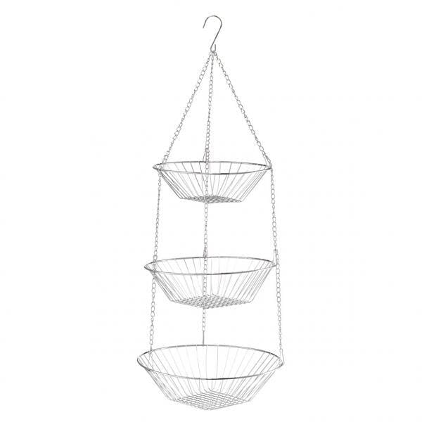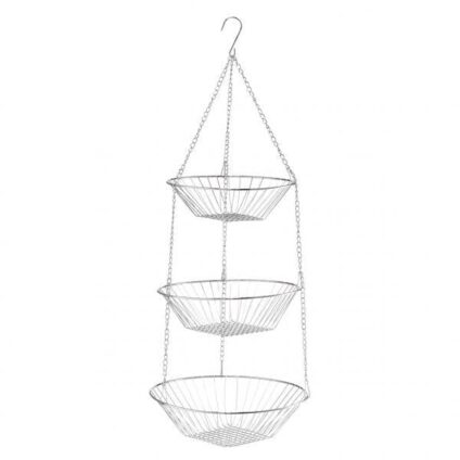 Dieser praktische Hängekorb aus hochwertig verchromtem Metall besticht durch sein klares Design. Er ist eine optische Bereicherung für Ihre Küche und Sie haben Ihr Obst & Gemüse immer griffbereit. Technische Daten: Gewicht: 463 g Maße: ca. Ø 25,5 x 72 cm Material: Metall Lieferumfang: Küchenampel 3-fach