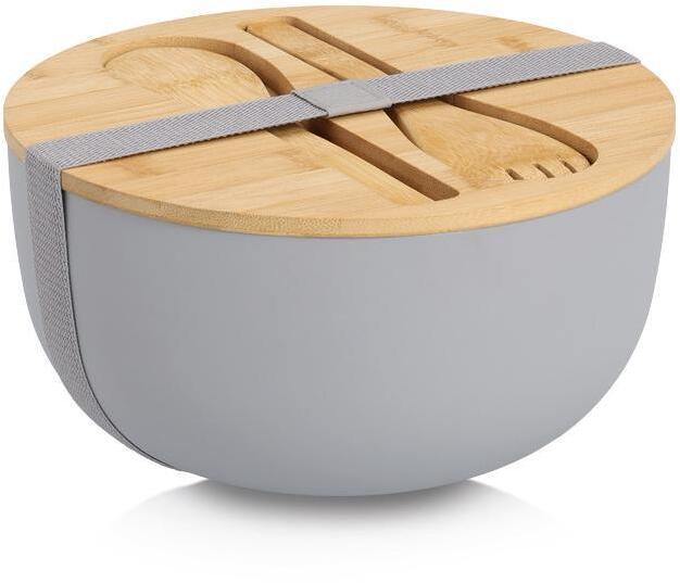 Mit unserem Salatschüssel-Set wird jeder Salat zum Genussmoment. Die harmonische Kombination aus sanftem Grau und natürlichem Bambus begeistert auf den ersten Blick. Besonders praktisch: Das Besteck ist im Deckel integriert und jederzeit griffbereit. So wird das Servieren zum Kinderspiel.Nachhaltigkeit die man sehen und spüren kannFrisch, stilvoll & durchdacht.hochwertiges Bambus 100 % FSCTechnische Daten:Material: Bambus/KunststoffAbmessungen: Ø 23,5 x 12,5 cmGewicht: 572 gFarbe:…