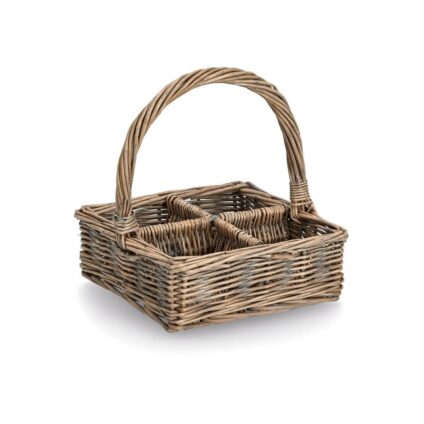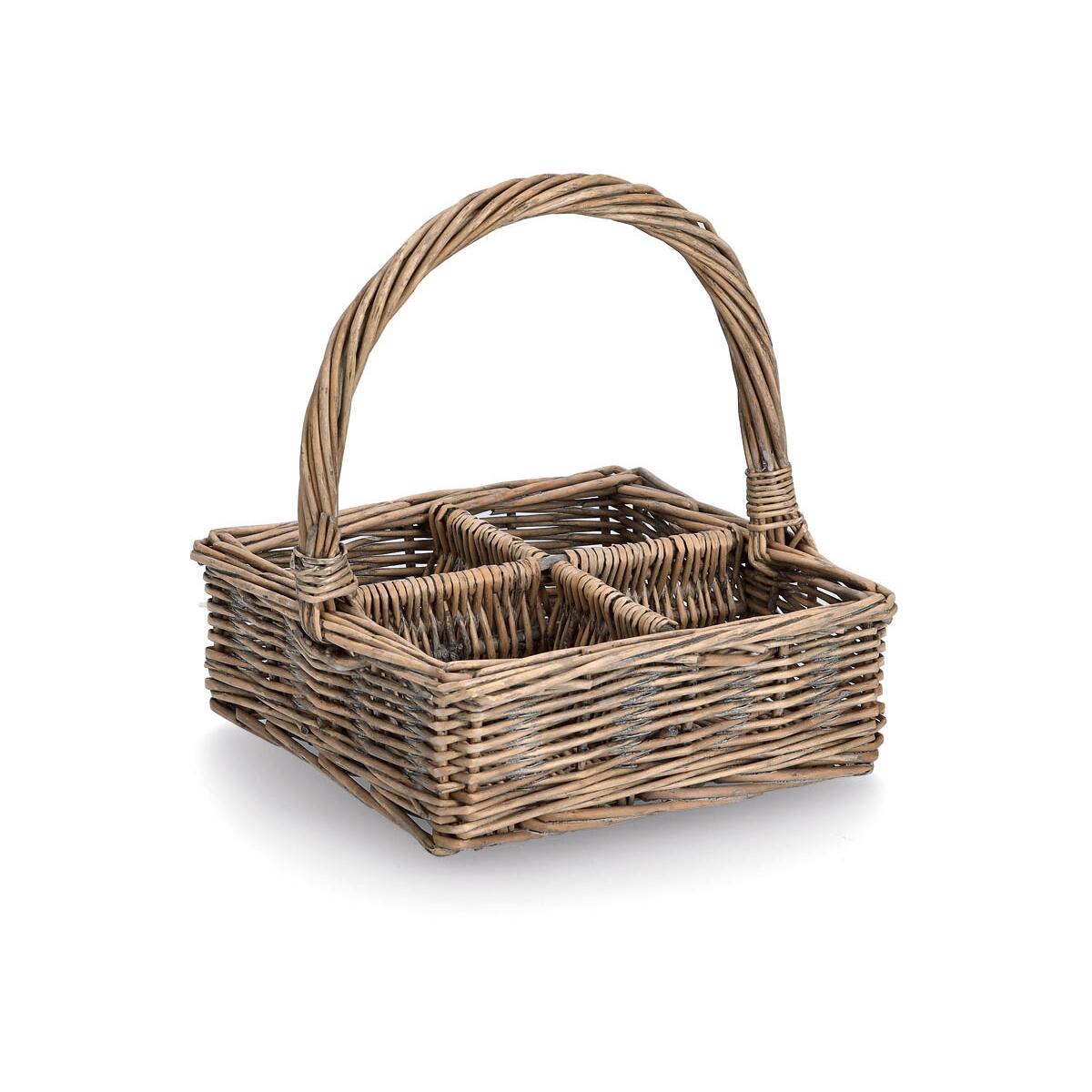 Ob Ölflaschen, Gewürze, Getränke oder Deko, unser Tragekorb aus geflochtener Weide bietet mit 4 Fächern in den ca. Maßen 7x7cm Platz für alles mögliche. Unser Tragekorb und Brot- sowie Baguette-Korb im gleichen Design vervollständigen die Serie und Sorgen für ein schönes Tischbild. mit 4 Fächern für Flaschen o.Ä. perfekt für den Tisch geeignet aus geflochtener Weide gefertigt praktischer Tragekorb mit Griff Technische Daten: Maße: ca. 21 x 21 x 7 / 23 cm Material: Weide Lieferumfang: 1…