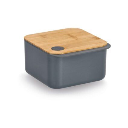 Dieser moderne Vorratsbehälter lässt keine Wünsche offen! Lunch-to-go: Mit dieser stylischen Vorratsdose aus PET kein Thema! In dem anthrazitfarbenen Vorratsbehälter lassen sich auch warme Speisen problemlos transportieren. Der Bambusdeckel der Dose ist mit einer Silikondichtung ausgestattet, um den Inhalt sicher und luftdicht zu verschließen. Das kleine Format des Behälters eignet sich besonders gut zur Mitnahme von Obst oder sonstigen Snacks. Die Vorratsdose ist aber auch in einer größeren Variante…