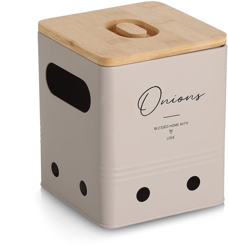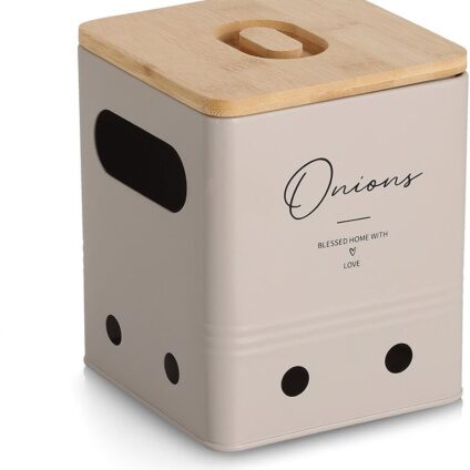 Mit dieser 2400 ml-Metalldose Onion in trendigem Greige haben Sie Ihren Zwiebelvorrat in der Küche stets griffbereit. Der Bambusdeckel schließt sanft dank Silikonring, der Griff erleichtert das Öffnen der Dose. Eingearbeitete Lüftungslöcher sorgen für eine optimierte Lagerhaltung und halten Ihre Zwiebeln frisch. Die schicke Metalldose ist nicht nur praktisch, sondern macht auch optisch einiges her. Ein Highlight in jeder Küche!Trendiges Design in GreigeBambusdeckel mit Silikonring für sanftes…