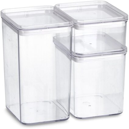Das 3-teilige Vorratsdosen-Set bietet ein praktisches Aufbewahrungssystem für Lebensmittel jeglicher Art. Das transparente Ensemble besteht aus Behältern in drei verschiedenen Größen. Die flexiblen Dichtungsringe sorgen für einen luftdichten Verschluss der Dosen und schützen somit den Inhalt optimal. Die Vorratsdosen sind stapelbar und deshalb besonders platzsparend. Dank des transparenten Kunststoffs hast Du stets eine gute Sicht auf den Inhalt und was eventuell nachbestückt werden muss. platzsparend…