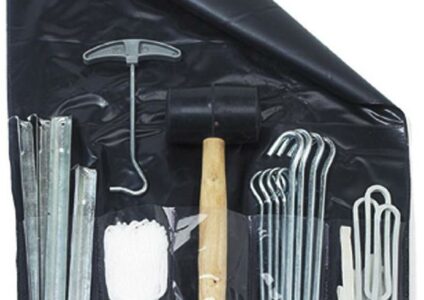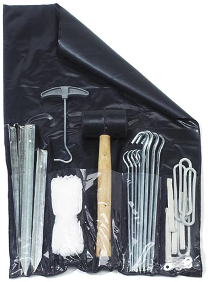 Tasche bestückt mit: 4 Spezial Erdnägel 4 Erdnägel 4 kurze Heringe 4 lange Heringe 6 Alu-Lochspanner 8 Gummiringe 1 Hammer 1 Heringsauszieher 1 Spannleine ø 4 mm, ca. 20 Meter