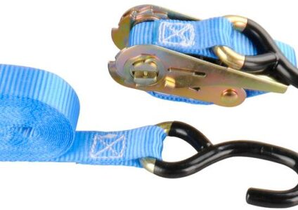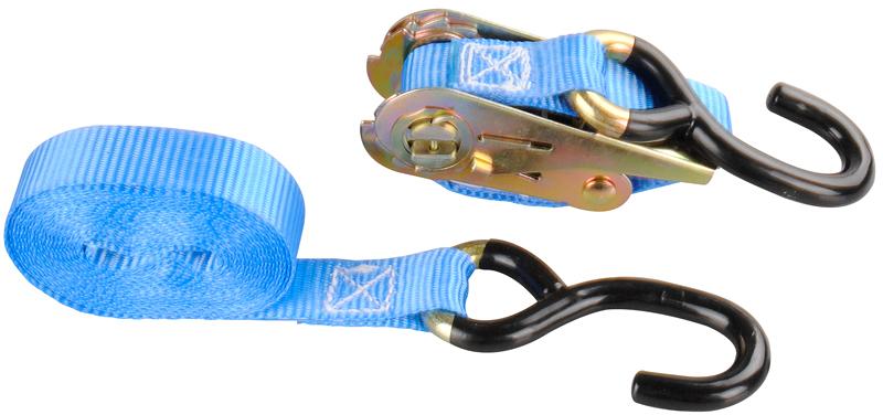 Mit PVC-beschichteten S-Haken. Bandbreite: 25 mm, zulässige Zugkraft: 400 daN. Bestehend aus: 1 Band inkl. Ratsche und S-Haken und 1 Band mit S-Haken. Technische Daten: Farbe: blau Maße (L x B): 400 × 2,5 cm Packmaß: 10 × 15 × 2 cm Gewicht: 571 g