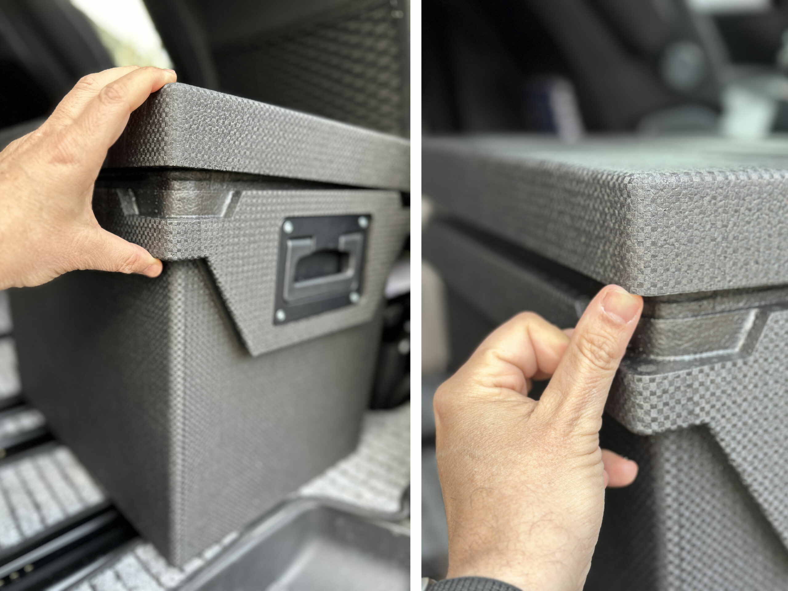 Gleich zu Beginn des Unboxing sind mir die eingelassenen Griffe aufgefallen. Sie versinken vollständig in der dafür vorgesehenen Mulde und lassen sich bei Bedarf ausklappen. Sie sind solide und kräftig, was wichtig ist, denn die Box ist gefüllt nicht eben leicht. Mit einer „Testbefüllung“ bin ich auf ein Gewicht von 16,4 kg gekommen. Durch die Klappgriffe kann man sie aber auch gut zu zweit gut tragen.