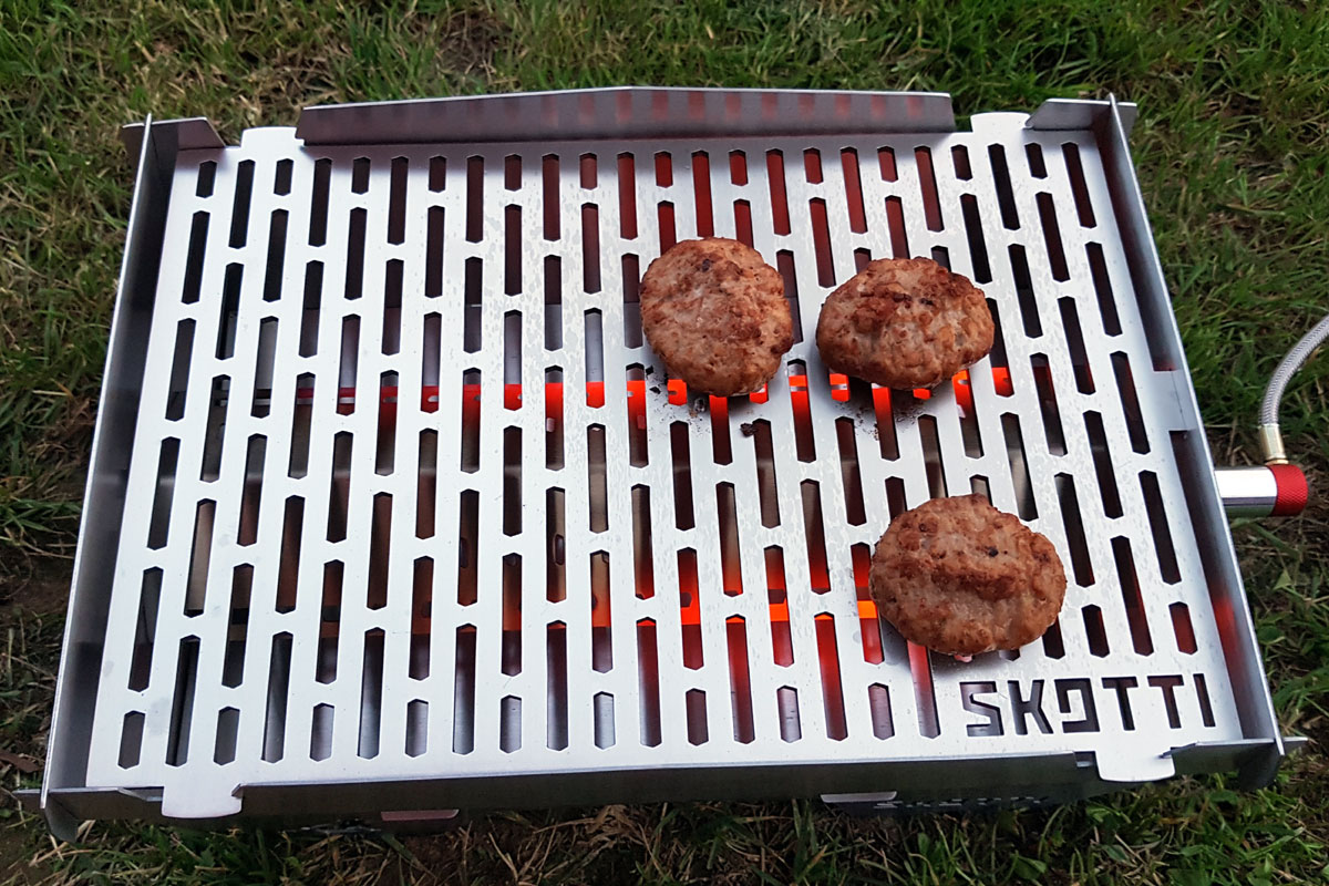 Der Aufbau des SKOTTI dauert ungefähr fünf Minuten, das „Vorheizen“ des Rosts noch einmal etwa zwei Minuten. Dann kann es losgehen. Je nachdem, wie stark man die Gaszufuhr aufdreht oder nicht muss man natürlich mal mehr bzw. weniger aufs Grillgut Acht geben. Denn bei voller Power gibt’s schneller Briketts als man gucken kann. Doch wenn man sich einmal an die optimale Gaszufuhr herangetastet hat, läuft’s wie’s Brezelbacken. Dabei ist es egal, ob man Fleisch, Würstchen, Soja-Burger, Grillkäse oder Grillgemüse auf den SKOTTI schmeißt. Und auch die Größe der Grillfläche erfüllt unsere Erwartungen. Für eine vierköpfige Familie ist genügend Platz vorhanden und weil es am Rand etwas weniger heiß wird, kann man hier auch mal einige Sachen „parken“.