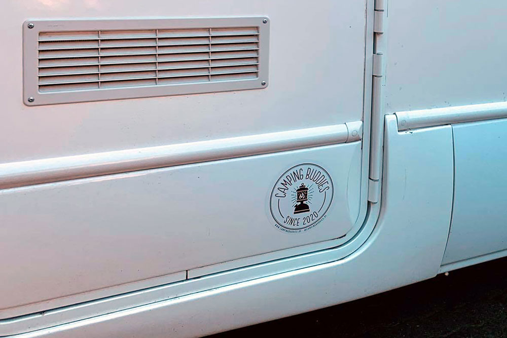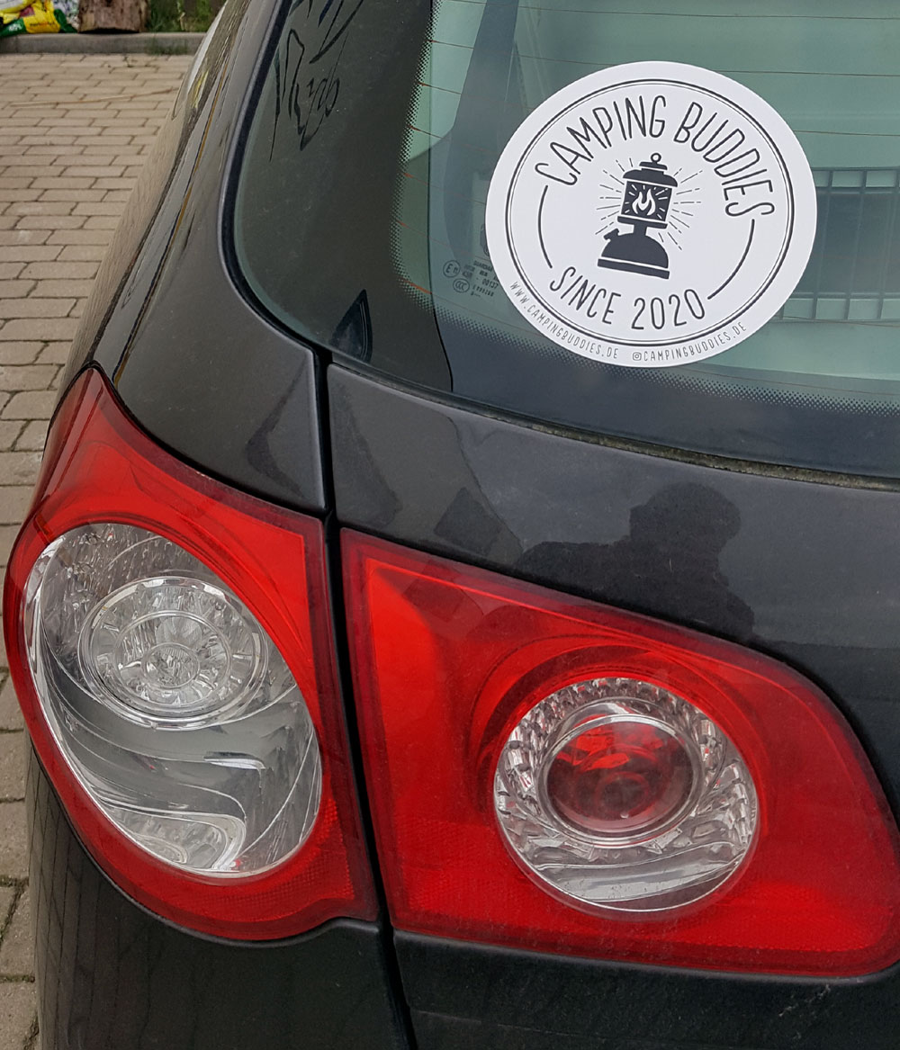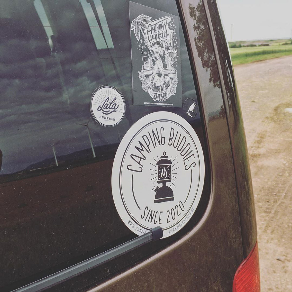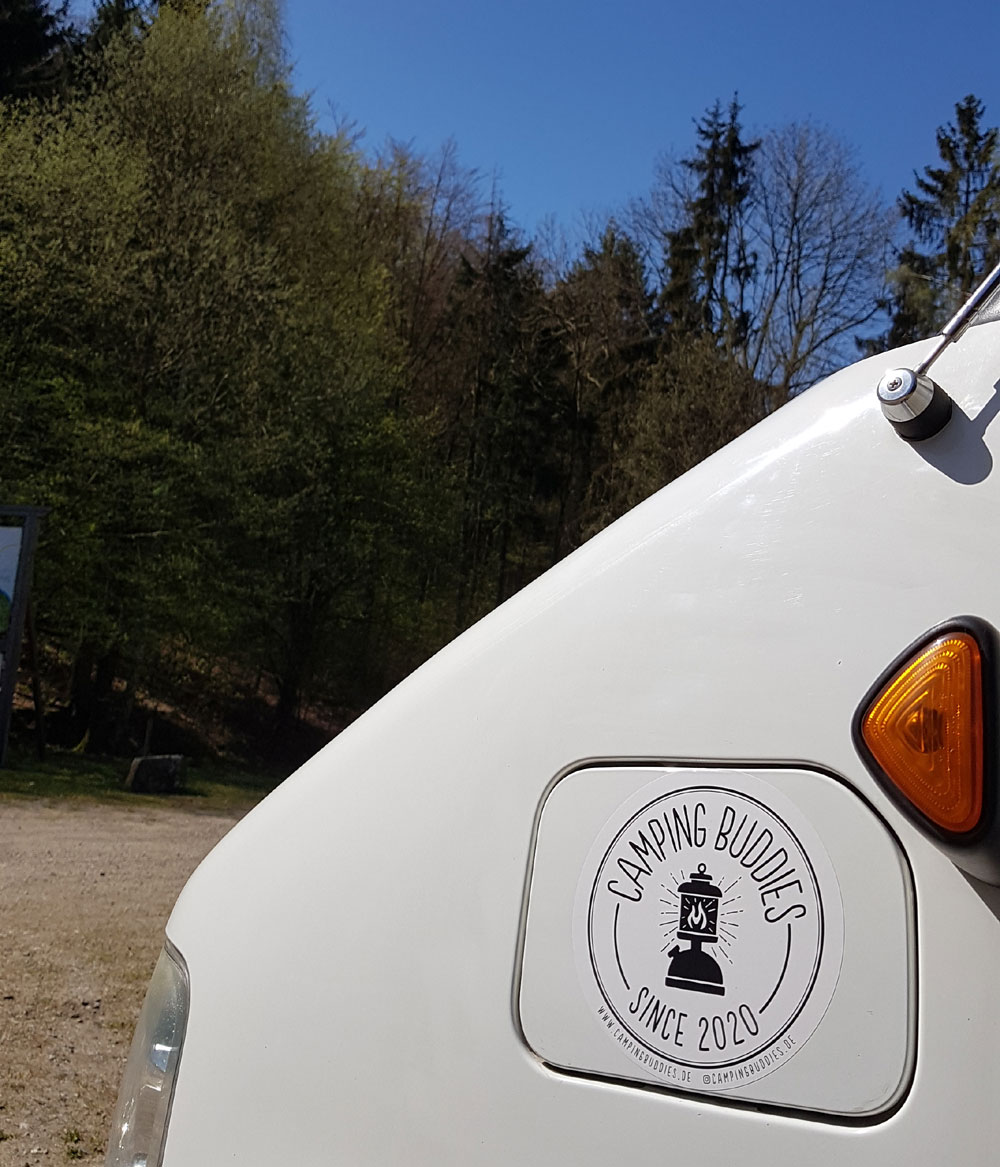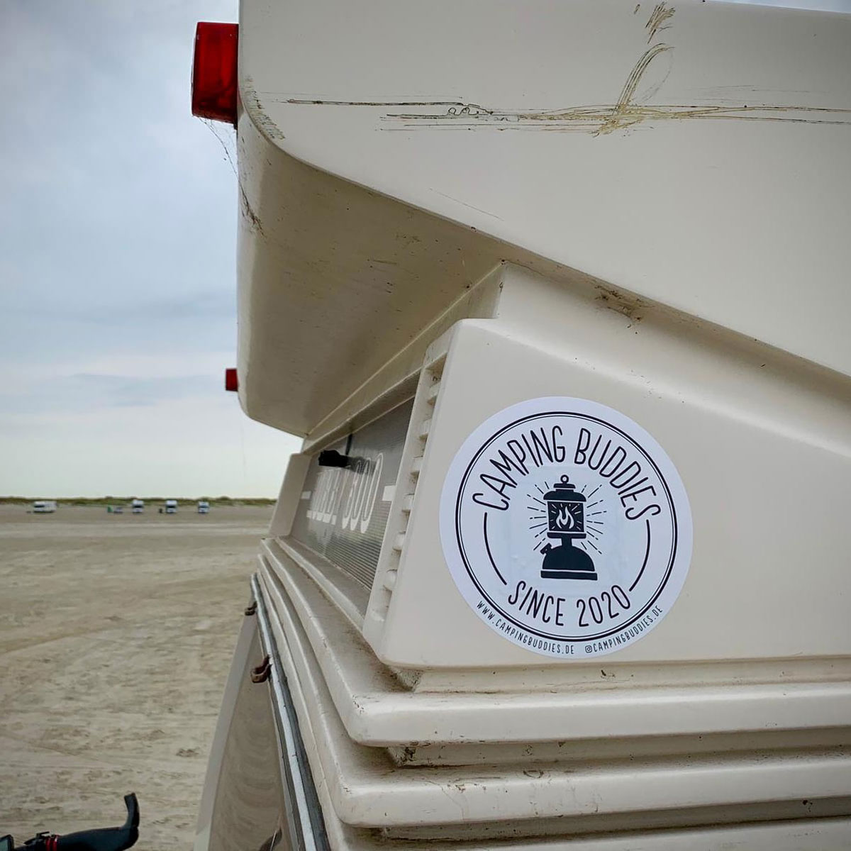 Da ist er – unser CampingBuddies-Sticker für euren Van, euer Wohnmobil, Caravan oder PKW. Also, wenn ihr Flagge zeigen wollt, euch unsere Seite gefällt und ihr noch ein kleines Plätzchen finden könnt, dann holt euch unseren natürlich 100% witterungsbeständigen CampingBuddies-Sticker.
