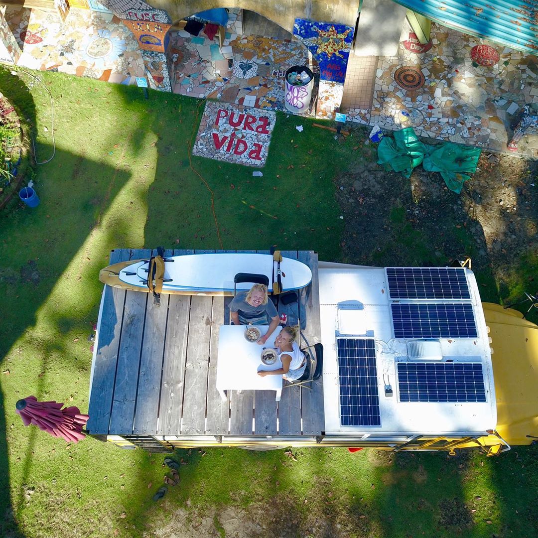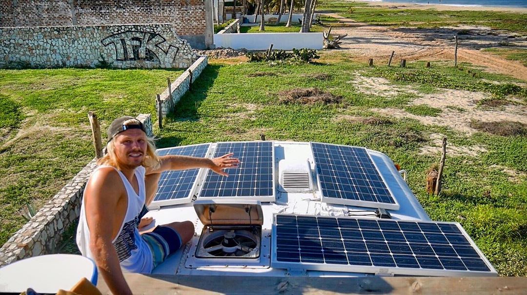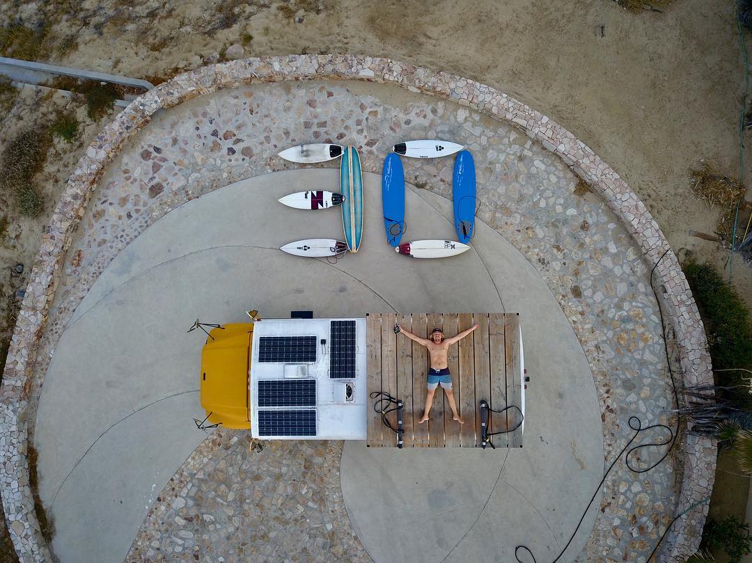 Das Besondere an meinem Bus ist definitiv die Dachterrasse. Und auf die bin ich auch besonders stolz. Immerhin war es meine erste Schweißarbeit überhaupt. Außerdem gefällt mir die gesamte Elektronik am Bus. Ich habe 400 Watt Solar auf dem Dach und lade damit meine 220ah-Batteriebank. Somit hat der Bus eigentlich immer ausreichend Strom um autark stehen zu können. Unter dem Bus habe ich noch einen Wassertank montiert, der ein Fassungsvermögen von 220 Litern hat. Genug Wasser um mindestens zehn Tage uneingeschränkt stehen zu können.