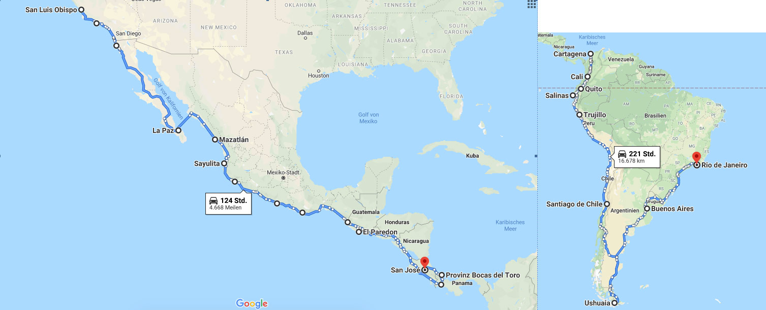 Gestartet ist die Reise in Kalifornien – genauer in San Luis Obispo. Von dort ging es über Mexiko, Guatemala weiter südlich nach Panama. Nachdem der Bus sechs Wochen beim Zoll in Panama stand (in der Zeit bin ich zum Arbeiten nach Hause geflogen), haben wir ihn (dann schon zusammen) Anfang Januar wieder abgeholt und startklar gemacht. Seitdem befinden wir uns auf der Inselgruppe Bocas del Toro an der Karibikküste von Panama.* Mitte Februar soll die Reise dann wieder etwas nördlicher Richtung Nicaragua gehen, wo wir gerne die Regensaison April – September verbringen möchten.