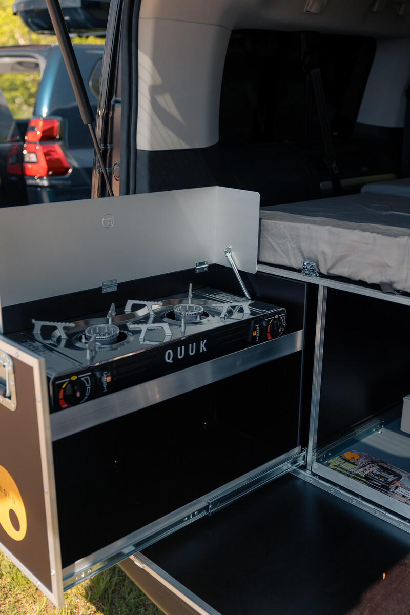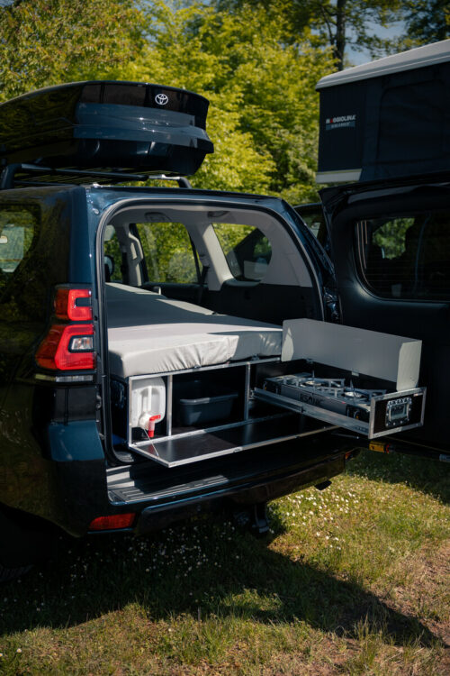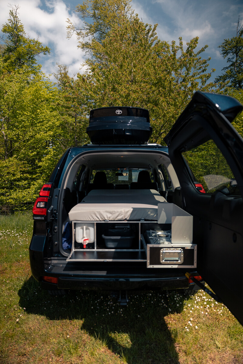 Die bereits im Proace vorgestellte Campingbox von QUQUQ kann auch für den Land Cruiser bestellt werden. Für mehr Platz sorgt die optionale Dachbox.